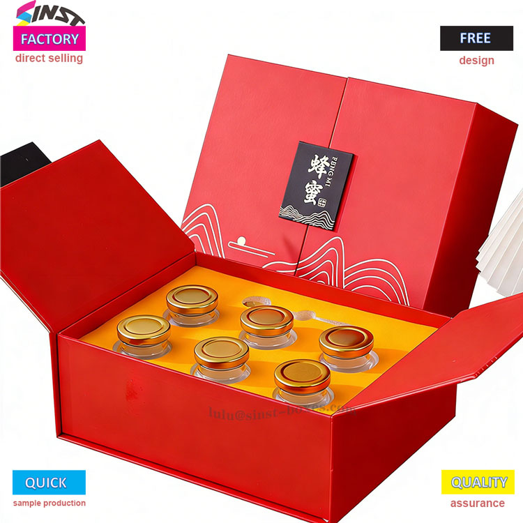 Majoritatea clienților apreciază caracterul practic al ambalajului atunci când aleg produsele, iar această cutie cadou Honey le satisface perfect nevoilor! Materialul gros din carton este rezistent la cădere și presiune, iar căptușeala încorporată cu absorbție a șocurilor poate proteja ferm borcanul de sticlă. Fie că este umplut cu miere de casă sau asociat cu ginseng și fructe de goji pentru a face o cutie cadou suplimentară, arată rafinat și greu atunci când este ținut în mână, oferind cadouri cu un plus de față.