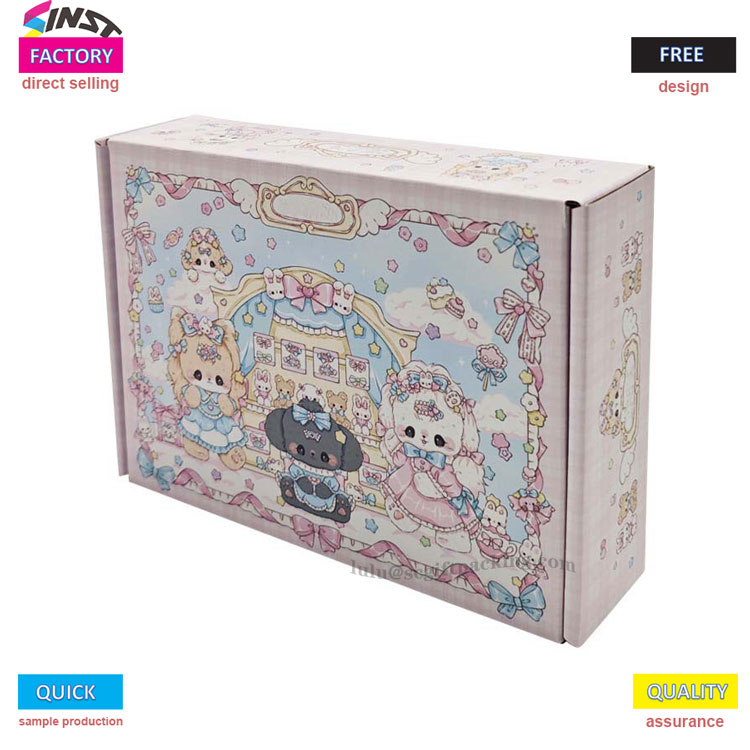 Cutia de avion de hârtie ondulată colorată pentru haine prezintă o schemă de culori roz dulce cu accente albastru deschis. Cutia este plină de elemente de desene animate, cum ar fi ghirlande cu flori, animale mici, arcuri, nori și inimi, creând un stil visător și drăguț. De la aspect la serviciu, împuternicește pe deplin ambalajele de îmbrăcăminte și îmbunătățește apelul de marcă.