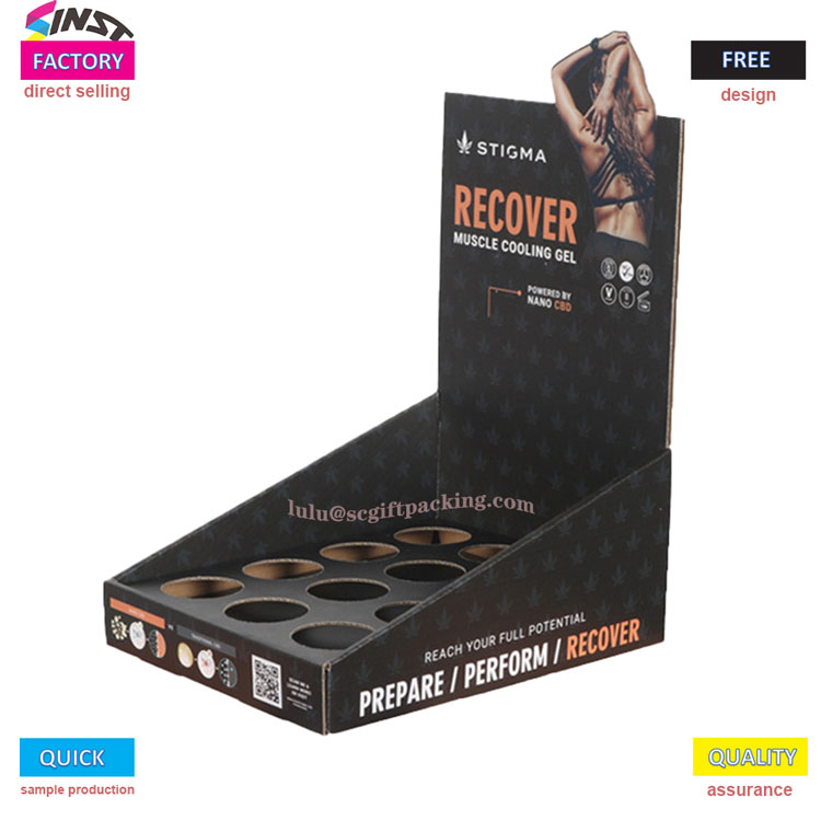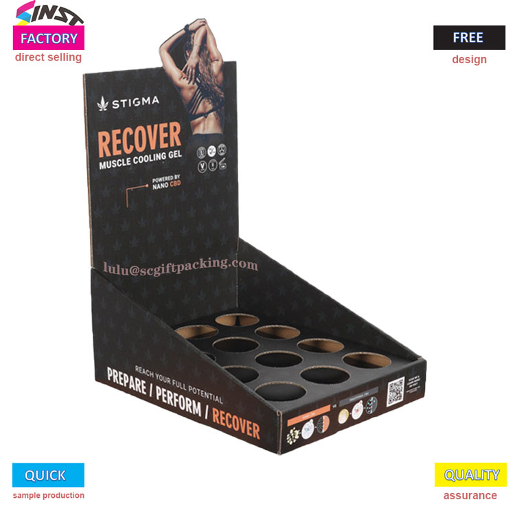 Această casetă de afișare a produsului de sănătate cu hârtie spațială goală are o estetică minimalistă, cu ștampilare fierbinte de fundal negru și un efect vizual puternic, evidențiind punctul de vânzare de bază al relaxării musculare după exerciții fizice. DISPLAY Rack adoptă un design de stocare a găurilor circulare cu mai multe grile, care nu numai că stabilizează afișajul, dar eliberează și textura produselor,