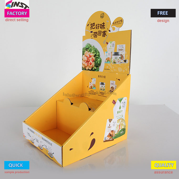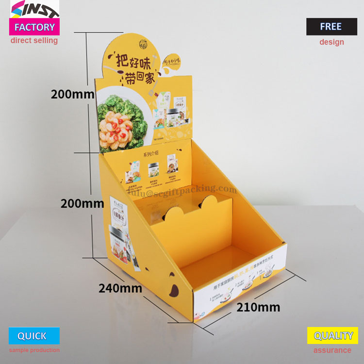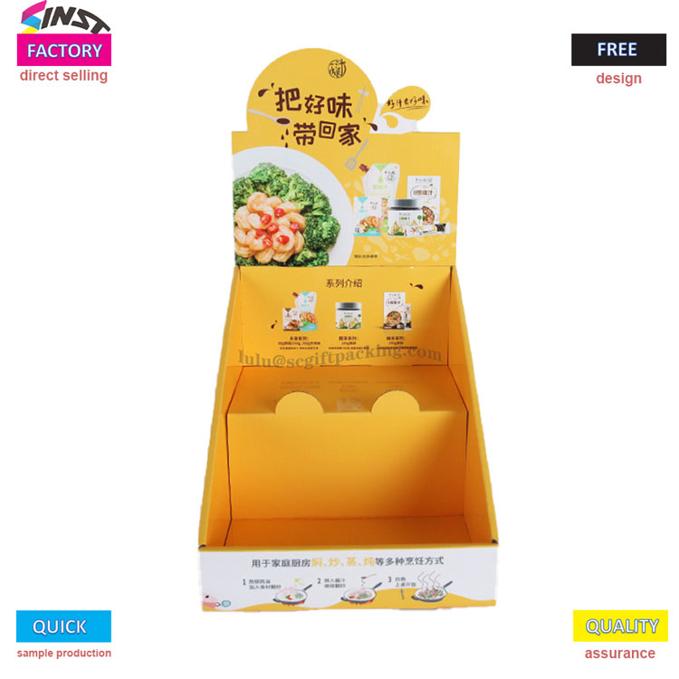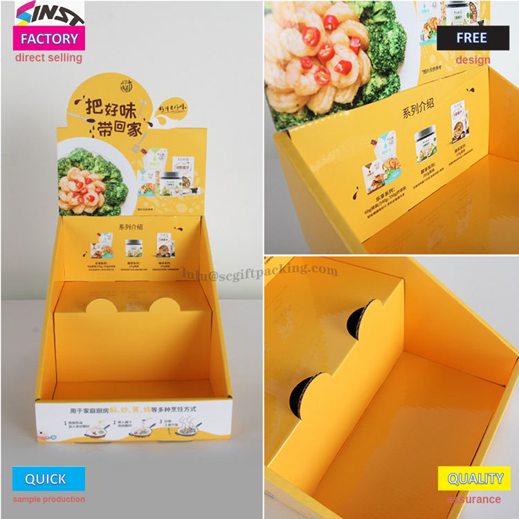 Aceasta este o cutie de afișare a cartonului de blat din supermarket, care poate fi o cutie de afișare a piper, o cutie de afișare a sării, cutia de afișare a esenței de pui, etc. Este în principal în culoare galben strălucitor și a devenit un instrument atrăgător pentru afișarea blatului!