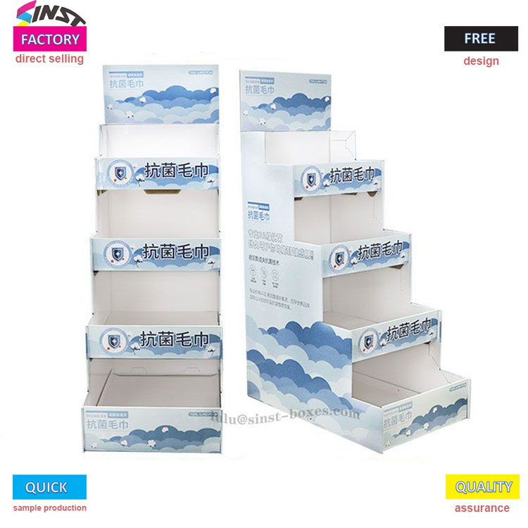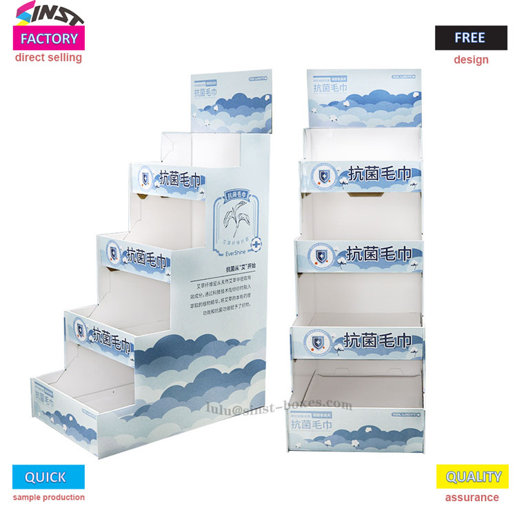 Acest suport de afișare din carton pentru prosoape este personalizat special pentru categoria de prosoape, cu o bază albă pură și nori albaștri și albi și mici imprimeuri florale imprimate pe acesta, oferind o senzație de revigorare care se potrivește perfect cu atributele de bază ale prosoapelor, care sunt „prietenos cu pielea și curate”; O structură treptă cu trei straturi cu o zonă de depozitare independentă, care permite sortarea și plasarea ușoară a șervețelelor, a prosoapelor de față și a articolelor portabile pentru un acces ușor.